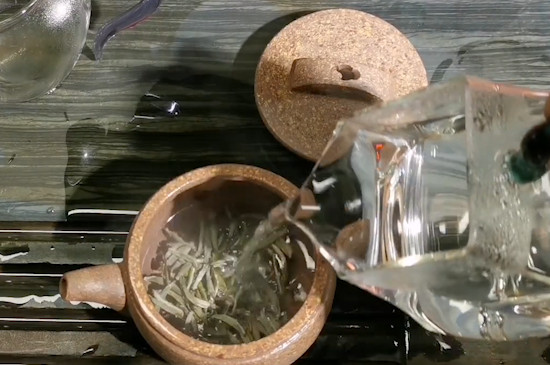 3人以上饮用新白茶时,可以选择肚大的紫砂壶。先取7-10克新白茶投入壶中,然后倒入90度以上的热水,水量至壶容量的三分之一时停止倒水,进行摇香,最后再次低冲热水,加盖闷泡40秒出汤。