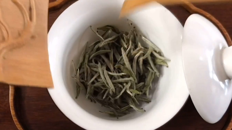 将盖碗烫洗干净后,用茶匙将4~6g白茶拨入盖碗中,注入沸水冲泡,并用茶匙快速搅拌茶汤,5秒后将茶汤快速倒掉。若是洗老白茶,则需在10秒后倒掉茶汤,并要洗2遍茶。