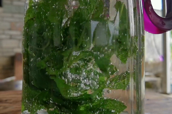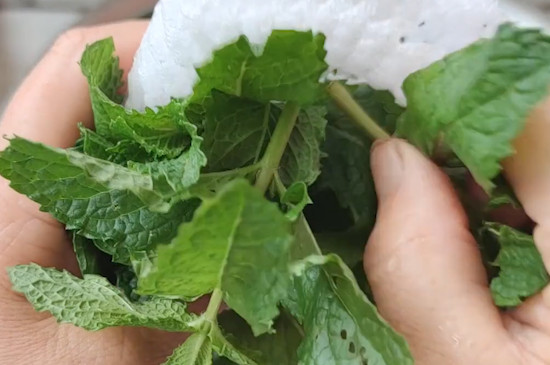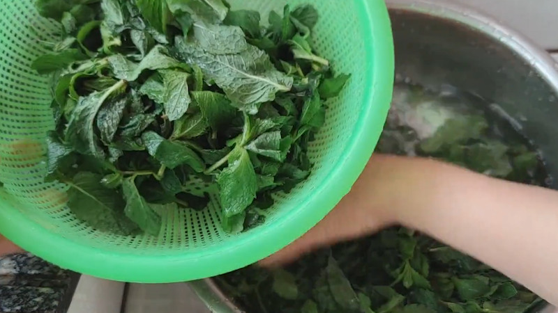 薄荷茶在制作时,先采摘新鲜细嫩的薄荷叶为原料,拣出里面的老叶残叶,之后将采摘好的薄荷叶用清水清洗干净,并放入盐水中浸泡10分钟的时间,随后捞出薄荷叶控干水分。