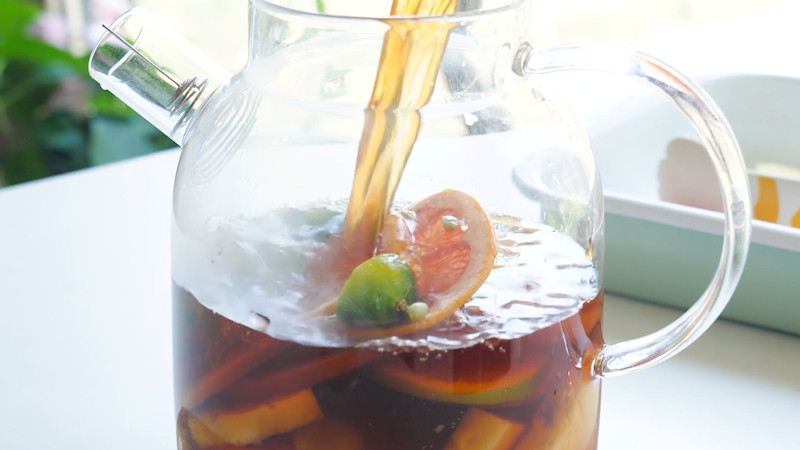 接下来把已经切片的柠檬、芒果、苹果放入几片到玻璃杯里,并添加250ml茉莉绿茶、30g百香果、60g果酱、30ml蜂蜜、10ml糖浆、150g冰块搅拌均匀,最后插上吸管即可饮用。