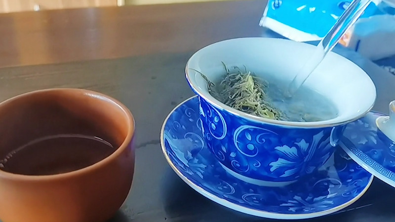 莓茶一次泡5~8g,能够连续冲泡5~6次。莓茶是以张家界为核心区域生长的小叶种显齿蛇葡萄植物,经杀青、揉捻、杀二青、复揉等工艺制成,呈整株状,叶片细嫩、颜色偏白、茶梗细小,冲泡后香气浓烈鲜醇,回甘迅速生津好。