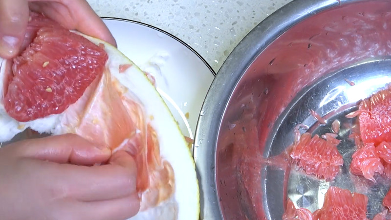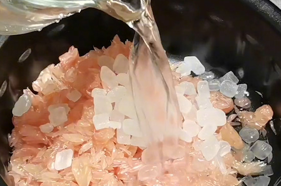 然后把剥离出来的柚子肉小心翼翼的剥开,并弄散,将柚子皮和柚子肉一并投入热锅里,加入适量清水以及冰糖,开小火慢慢熬煮2小时,直到柚子皮呈深黄色即可。