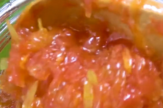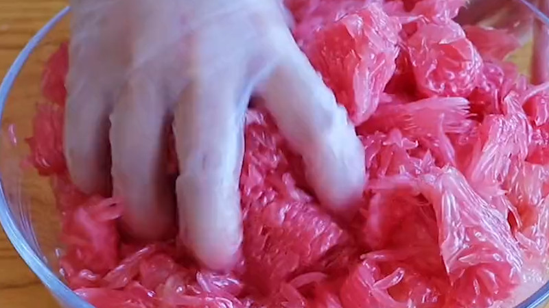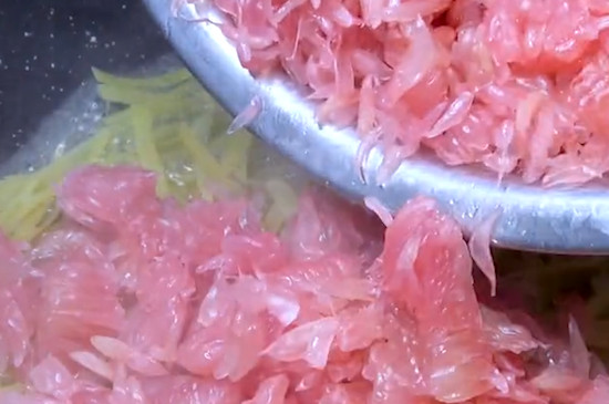 接下来削下来的柚子皮切成均匀的细丝,再次用食盐使劲儿揉搓柚子皮3次。然后将柚子皮放入温盐水中浸泡8~10小时,柚子肉也要剥碎,放入容器中,置于冰箱内冷藏。