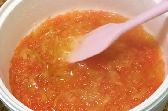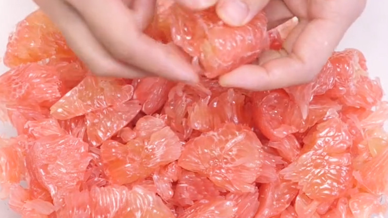 然后将切好的柚子皮用食盐搓洗3次,并放入温盐水中浸泡6~8小时。与此同时也要将柚子肉上的籽和白色部分清除干净并剥碎,放入容器中,置于冰箱里备用。