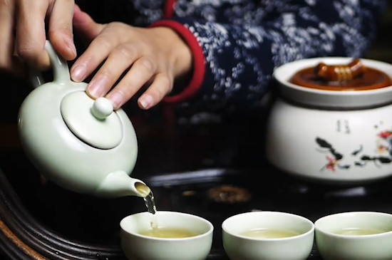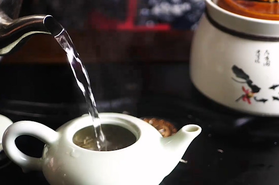 继续往瓷壶中注入沸水,盖上紫砂壶,焖泡5~10分钟,等莓茶泡好后,将瓷杯码放好,提起瓷壶,往瓷杯中依次注入茶汤,最后端起瓷杯品饮即可。