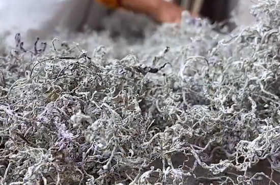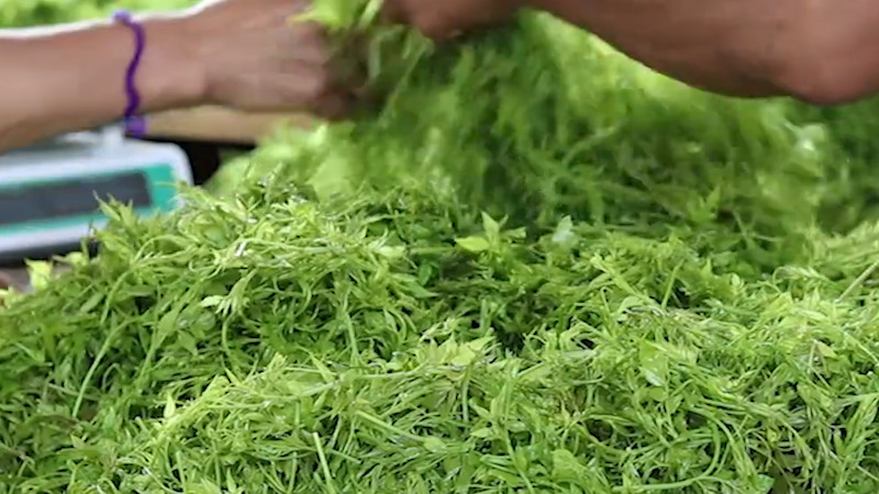 莓茶在制作时,采摘一芽两叶或三叶的小叶种显齿蛇葡萄植物,用清水洗净后放入热锅中炒制,需双手握叶成团,以顺时针方向旋转团揉,先轻后重,将茶叶揉至叶卷成条,白霜显露。