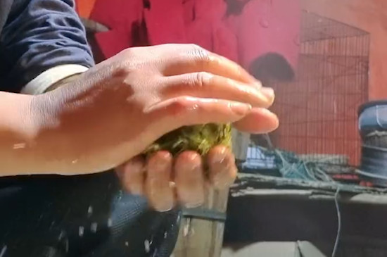 接着采用炒或烘的方式,将锅温控制在80℃,让茶叶烘至4~5成干,随后再次揉茶,方法与之前相同,只是在加压或用力时要比之前揉茶时重一些,接着将揉捻成团的莓茶进行解块。