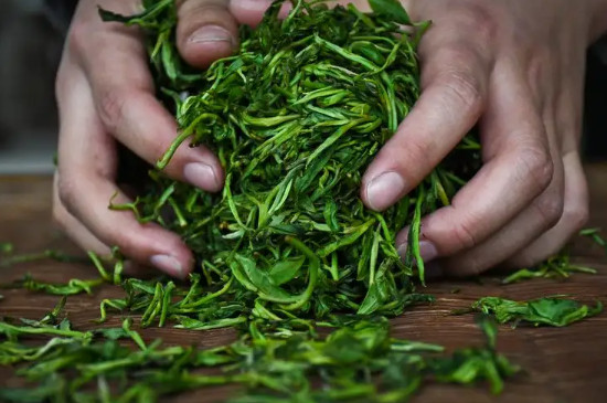 接着把铁锅洗干净后放在灶台上烧热,等锅温达到120℃时,把萎凋好的枸杞叶倒入铁锅中烘炒杀青,使叶片水分继续散发,每2kg炒1锅,连续翻炒4~5分钟,直至叶片柔软、握之成团、手松不散,闻之青味消失,略呈清香为止。