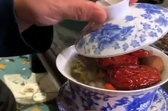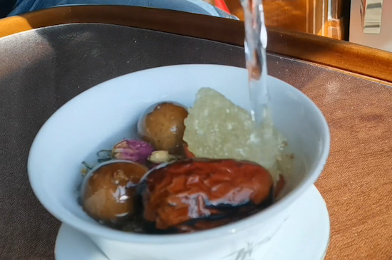 接着取出瓷壶和瓷杯,用茶叶铺底,然后依次放入红枣、沙枣、桂圆、核桃仁、葡萄干、枸杞,注入沸水,并用茶匙快速搅拌茶汤,5秒后倒掉茶汤。