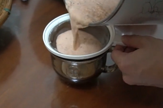 随后取出玻璃杯置于一旁,把龙眼壳拨开,取出龙眼肉,去核后放入清水中浸泡,将其表面所含有的杂质清洗干净,之后将龙眼肉放入榨汁机中榨汁。