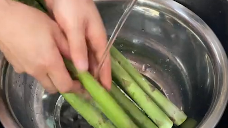 芦笋茶在煮制时,先把芦笋放入容器中,加入清水,把芦笋反复清洗干净。接着把芦笋取出,放在案板上,用菜刀将芦笋切成小段,便于冲泡。