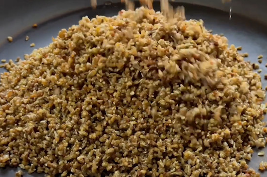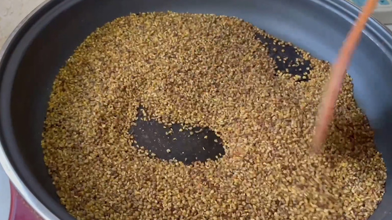 接下来把蒸熟的苦荞麦放入炒锅中均匀翻炒,并从高到低逐步调温,让苦荞麦中的水分快速挥发,快速升温。把苦荞麦炒好后,用喷壶将干净的凉水均匀喷洒在苦荞麦上,使苦荞麦表面的壳迅速膨胀,让苦荞麦的外表硬壳与麦仁分离。
