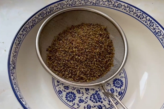 随后将上道工序的苦荞麦再次放入家用风干机里,开热风干模式低温烘干苦荞麦的表皮,再去除上面的麦壳,保留苦荞麦仁,最后将制好的苦荞茶装入密封性良好的容器中即可。