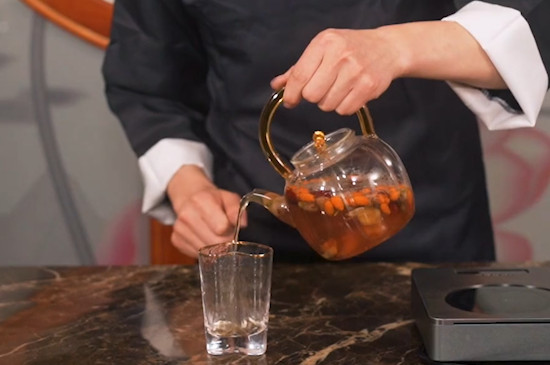 红枣茶,将红枣去核后,投入玻璃杯中用沸水冲泡;普洱茶,将普洱茶投入紫砂壶中,注入沸水冲泡;桂花茶,将晒干的桂花茶投入玻璃杯中添加红糖调饮;枸杞茶,将枸杞投入玻璃杯中注入沸水冲泡;姜苏茶,把弄好的生姜和苏叶投入玻璃杯中用沸水冲泡。