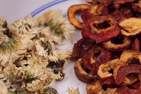 山楂可以和菊花一起泡水喝,将山楂和菊花各5g投入玻璃中,加入适量冰糖,注入沸水冲泡,并用勺子搅拌均匀,等到冰糖化开后饮用。