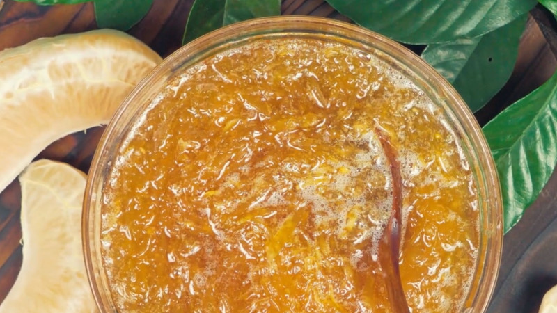 将柚子皮熬煮10分钟后,倒入柚子肉,继续用小火煮1个小时,直到柚子茶的汤汁逐渐变少变粘稠,这时需将柚子茶倒入容器中自然放凉,最后加入500g的蜂蜜密封保存。
