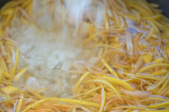 随后将剥下来的柚子肉剁成小碎块,越碎越好,装入容器中放入冰箱保存,等到柚子皮泡好后,将柚子皮和冰糖一并投入锅中,加入2碗清水,开大火煮沸,煮10分钟后投入柚子肉。