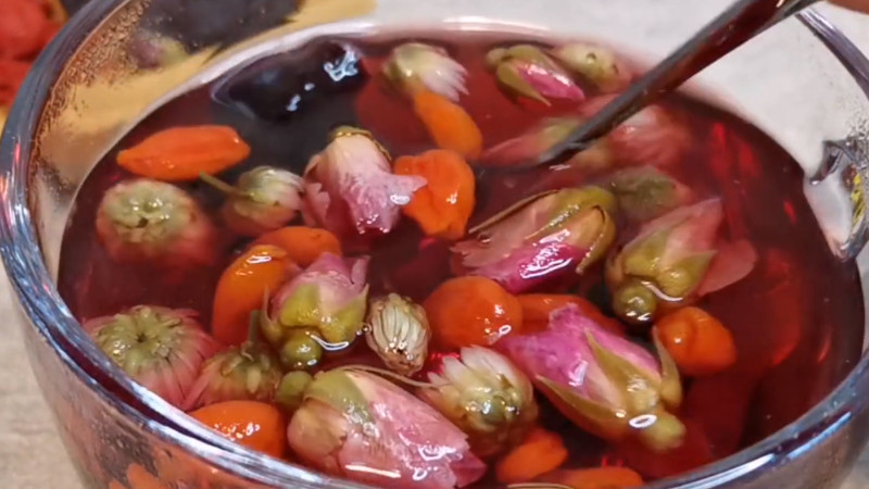 玫瑰花蜜茶,倒入清水煎煮干玫瑰花,之后添加蜂蜜调饮;菊花百合麦茶,将小麦、菊花、百合投入茶壶中煮;玉竹安神茶,将玫瑰花、洋甘菊、马鞭草放入茶包中冲泡;龙须菖蒲茶,将龙须和石菖蒲一并放入锅中倒水煎煮。