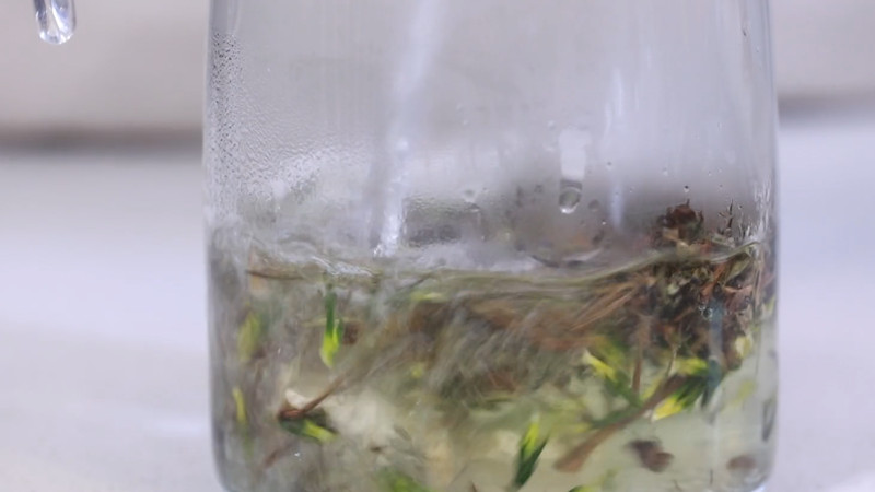 莲子心泡水时一次放8~10颗即可,冲泡太多就会导致茶汤的滋味过于苦涩。莲子心在泡水时,先将玻璃杯烫洗干净,再将莲子心投入杯中,注入沸水,3秒后倒掉茶汤,并继续注入沸水,盖上杯盖焖泡5分钟即可。