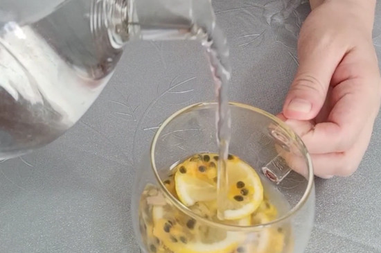 柠檬百香果茶在制作时,先将1颗百香果洗净切开,挖出果肉投入玻璃杯中,再将1颗柠檬洗净切片,投入2片柠檬到玻璃杯中,倒入60℃开水,添加适量蜂蜜即可饮用。