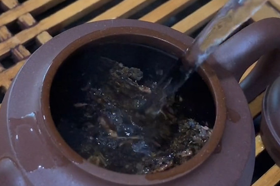 将黑茶清洗完成后,需往紫砂壶中注入沸水,并加盖进行闷泡,5~7分钟后便可将泡好的茶叶倒入茶杯中进行品尝。待黑茶茶汤剩余三分之一时,需再次注入沸水进行冲泡。