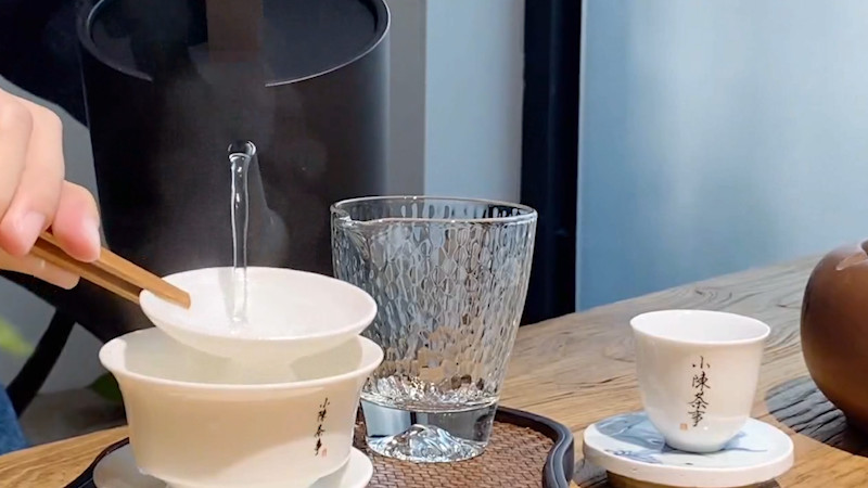 接着继续往盖碗中注入沸水,并盖上碗盖,焖泡4~6分钟的时间,最后端起盖碗,揭开碗盖,细嗅工夫红茶的茶香,观察工夫红茶的茶汤和叶底,最后细啜工夫红茶的滋味。