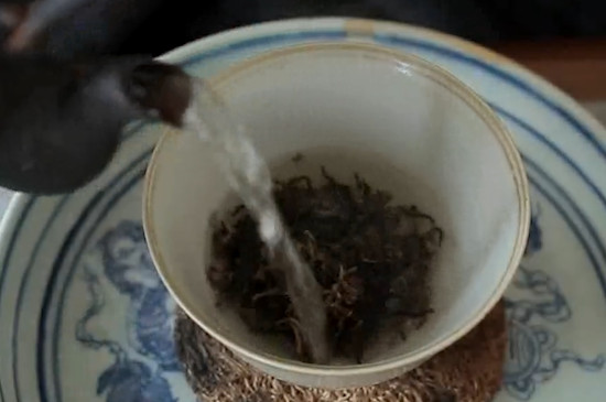 接下来取出盖碗,用茶匙把5~7g工夫红茶投入盖碗中,注入90~100℃的沸水冲泡,并用茶匙快速搅拌,5秒后倒掉茶汤,把工夫红茶中的杂质清洗干净。