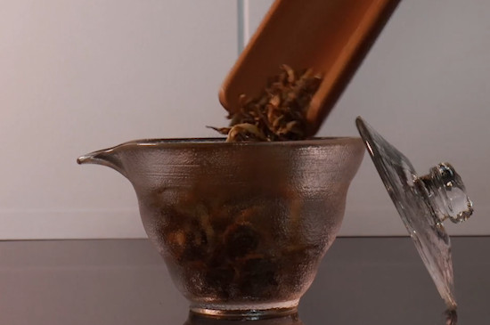 接着取出盖碗,用茶匙将5~7g尼泊尔红茶投入盖碗中,注入90~100℃的沸水冲泡,并用茶匙快速搅拌茶汤,5秒后倒掉茶汤,把尼泊尔红茶中的杂质清洗干净。