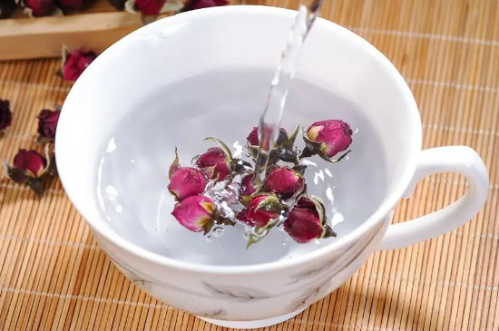 冲泡玫瑰花茶时,可以使用玻璃杯作为茶具,先取3-5朵干玫瑰花放入杯中,之后冲入80度的水,等待5秒后将茶水倒掉,第二泡直接倒入温水,等茶水变为淡淡的红色即可饮用。