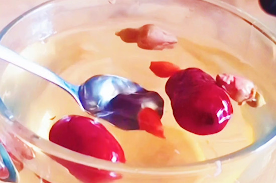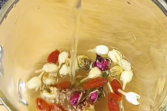 准备5-8颗玫瑰花、3颗红枣、1-2克枸杞,直接将所有的食材放入玻璃杯中,然后倒入刚烧开的沸水,闷泡3-5分钟即可。玫瑰花红枣枸杞茶汤色鲜艳,滋味甘甜,一年四季都可饮用。