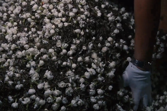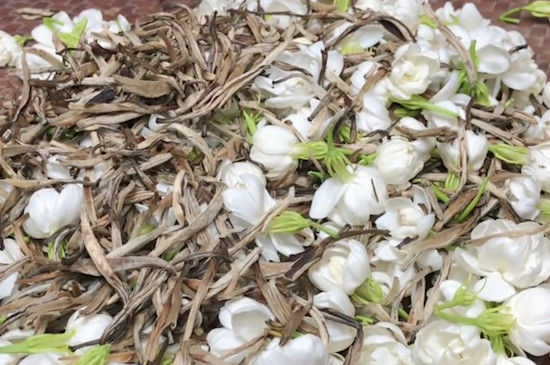 茉莉花茶制作时,先采摘新鲜的花苞,将其清洗干净后摊放在通风处,期间要不断翻动,以防温度过高,出现烧花的现象。等待茉莉花表面的水分完全干透后即可进行下一步。