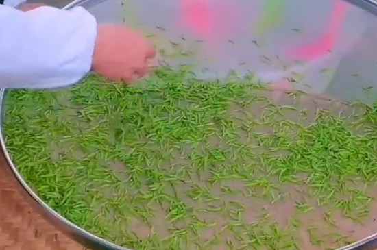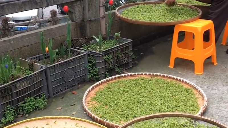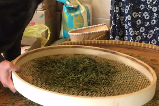 龙井茶的鲜叶在刚采回来时,需将其薄摊在竹匾上,厚度以1cm为宜,摊好后放置于阴凉干燥处2小时,让鲜叶自然发挥多余的水分,以此来减少苦涩味,保持鲜爽。