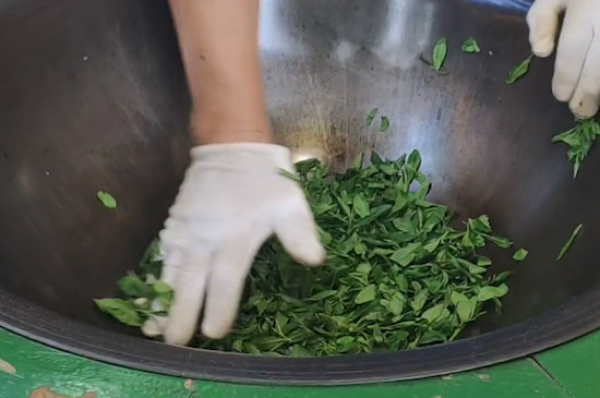 把摊放后的鲜叶放入锅中,用手炒干,让鲜叶初步定型,当锅温达到100~120℃时,需在锅内涂抹炒茶专用油,投入摊放过的鲜叶,先以抓和抖的手势为主,再改用搭、压、抖、甩等手势定型,待鲜叶7成干时起锅回潮,整个过程需要12~15分钟。