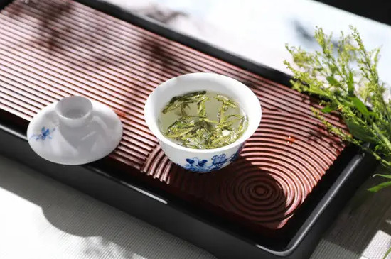 盖碗也能用来喝龙井茶,出汤时食指放在盖钮上,拇指和中指抓住碗沿的两侧,然后缓缓端起。品尝龙井茶时,先用碗盖轻轻拂动茶汤,接着小啜一口。