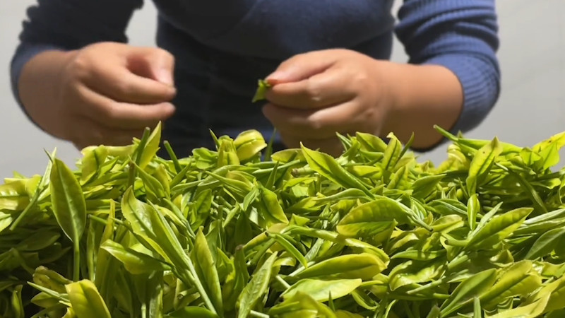 手工炒制绿茶之前,先将刚采好的茶叶均匀摊放在竹匾上,认真的把上面的老叶、残叶、枯叶以及其他杂物等全部清理干净,并将茶叶用清水洗净。