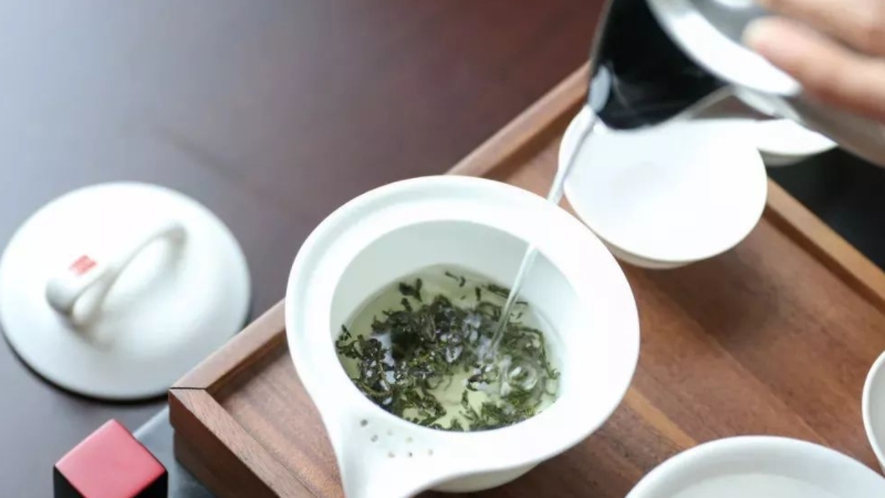 上投法是先注水,再投茶。冲泡绿茶时,先往玻璃杯中注入85度左右热水150-200ml,再往杯中投茶3-4g。看到茶叶沉到杯底,汤色变得嫩绿明亮,闻到清香后,就可以细口品饮了。