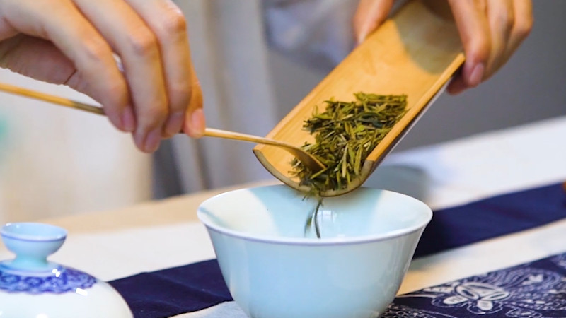 接着将4~6g天目青顶用茶匙投入玻璃杯中,注入80~85℃的开水冲泡,随后用茶匙快速搅拌茶汤,并在3秒后把茶汤倒掉,之后继续往玻璃杯中注入开水,1分钟后就可以饮用了。