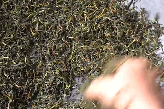 接着将已经炒好的茶叶倒入簸箕中,趁热揉捻茶叶,把茶汁揉出来,使茶汁得以附着在茶叶表面,茶叶需经三炒三揉的工序,直至茶叶中的水分只剩下20%,方可成茶。
