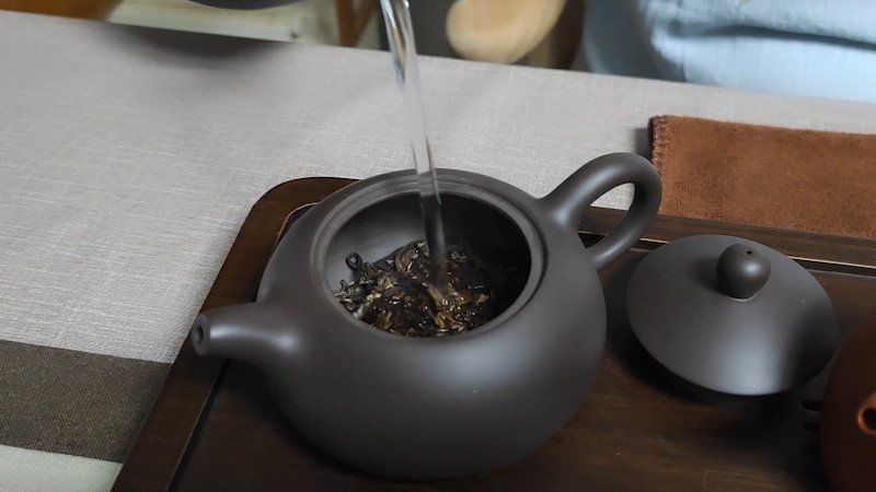 接下来把紫砂壶和紫砂杯取出,用茶匙把8~10g普洱生茶投入紫砂壶中,注入沸水冲泡,并用茶匙快速搅拌茶汤,5秒后倒掉茶汤,再洗1~2道茶,去除普洱生茶中的脏污。