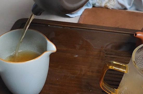 普洱生茶在冲泡时,先将紫砂壶放入茶洗中,揭开壶盖,注入沸水,再盖上壶盖,用沸水浇淋紫砂壶。随后用茶夹夹取紫砂杯,放入茶洗里,提起紫砂壶,倒出沸水烫洗紫砂杯。