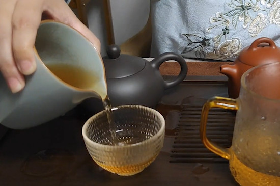 随后往紫砂壶中注入矿泉水,把紫砂壶放在茶炉上将茶汤烧开,与此同时码放好紫砂杯,等茶汤烧开后,提起紫砂壶,以高冲的形式将茶汤注入紫砂杯中品饮即可。
