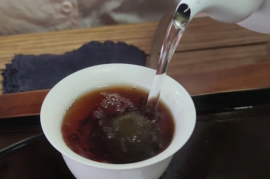 小青柑冲泡时,先把盖碗放入茶洗中,揭开碗盖,注入刚烧开的沸水,再盖上碗盖,把沸水浇淋在盖碗上。或将盖碗放入玻璃茶洗中,倒入清水,置于茶炉上将清水烧至沸腾,给盖碗消毒。