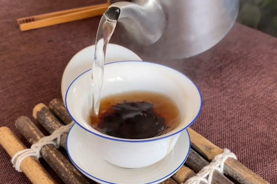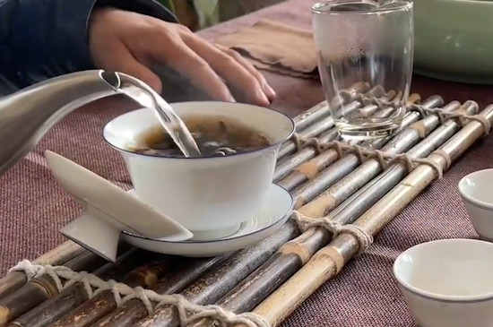 普洱熟茶投放之后,再烧一壶热水,水开后缓缓注入盖碗中,浸润5-10秒后快速将水倒掉。通过洗茶,不仅可以清除普洱熟茶表面的灰尘、杂质,还能唤醒茶叶内质,使内含物质更容易浸出。