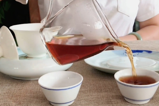 熟普冲泡完成后,即可将茶汤倒出,先准备几个干净的品茗杯,用热水烫洗后,依次摆放在桌子上,然后将盖碗中的茶水均匀的倒入品茗杯中。注意茶水不要超过七分满,这是对客人的一种尊重。