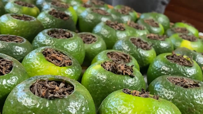 小青柑冲泡方式较多,除了掀盖冲泡外,还可以直接整颗投放到杯中泡茶,或者用茶针在小青柑表皮扎九个小孔,然后放入盖碗中,倒入沸水冲泡,这种方式也被称为九孔冲泡法。