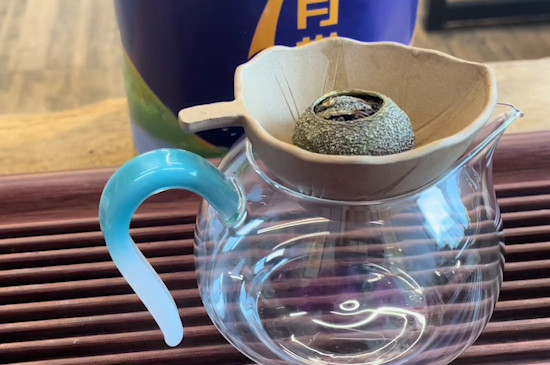 准备一个完整的小青柑,外包装撕开后,将果柑的顶盖掀开,接着将茶漏支放在公道杯上,直接将小青柑放入茶漏中,然后用沸水淋冲。掀盖冲泡的方式,会使茶汤更加干净透亮,滋味较为清爽。