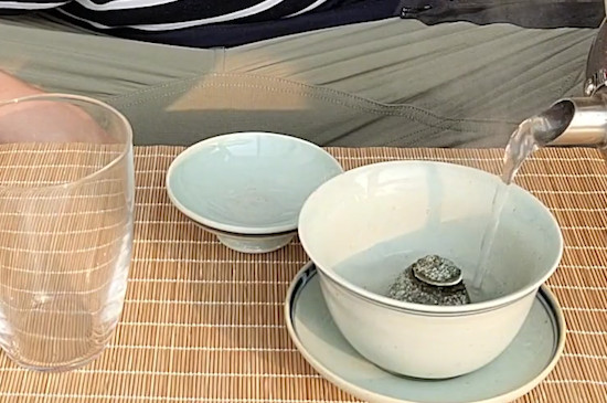 小青柑果皮较厚,且附有较多的粉尘和杂质,冲泡之前,先将其顶盖掀开,接着把小青柑放入盖碗中,第一泡冲入沸水进行洗茶,浸润10秒后将茶水倒掉,以唤醒普洱茶内质,有利于茶味快速析出。