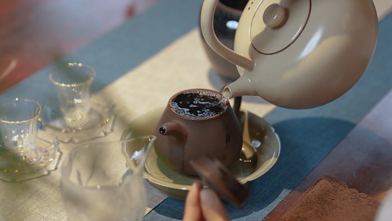 当普洱熟茶冲泡至3~4泡时,需盖上盖进行闷泡,3~5分钟后,从紫砂壶中会飘散出熟茶的香气。这时可将泡好的茶汤倒入茶杯中,待水温适口后,便可细细进行品尝茶香。
