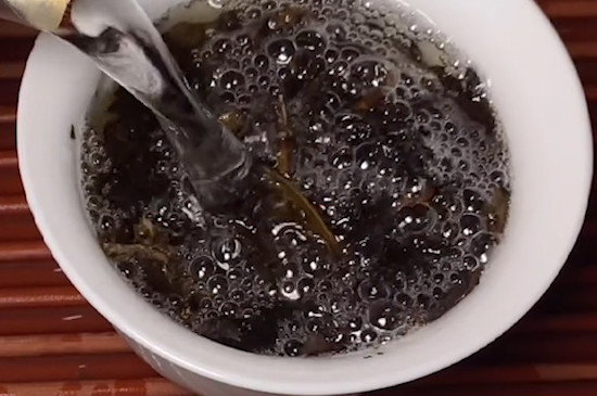 接着取出紫砂壶和紫砂杯,用茶匙把7~10g武夷水仙投入紫砂壶中,注入沸水冲泡,并用茶匙快速搅拌茶汤,5秒后倒掉茶汤,将武夷水仙中的脏污清洗干净。