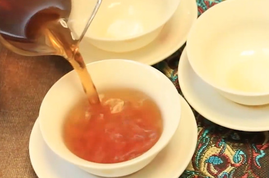 用开水冲泡后的老枞水仙汤色清澈橙黄,叶底厚软黄亮,叶绿朱砂红边或红点,闻之香气浓郁,有一股幽柔的兰花香气,也有的老枞水仙则带有一股乳香或水仙花香,品饮之后滋味醇厚回甘,即所谓的“三红七青”。